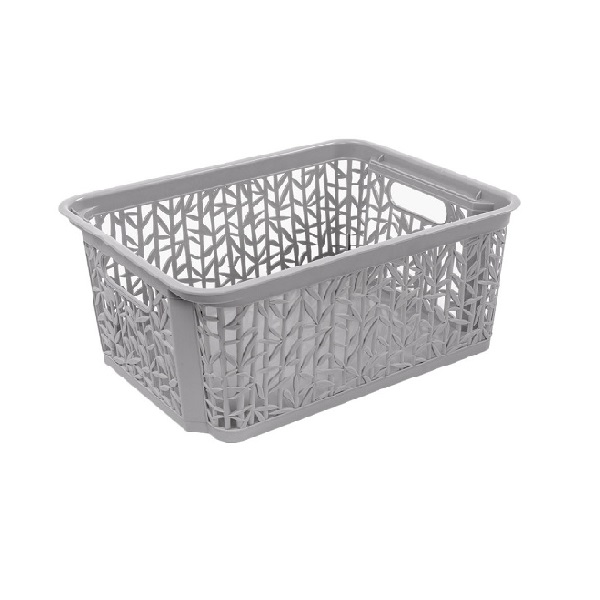 Plastikowy, ażurowy koszyk. Ażurowy wzór motywowany gałązkami i listkami bambusa. Koszyk wykonany z wysokiej jakości tworzywa. Rodzaj zastosowanego plastiku zapewnia bardzo dobre parametry wytrzymałościowe. Koszyk idealny do przechowywania i segregowania drobnych przedmiotów, zabawek, klocków, dziecięcych ubranek, dokumentów itp. Koszyki można piętrować - odpowiednio ustawiając koszyki wchodzą jeden w drugi lub w odwrotnej pozycji stoją jeden na drugim /tzw koszyki nastawne/.