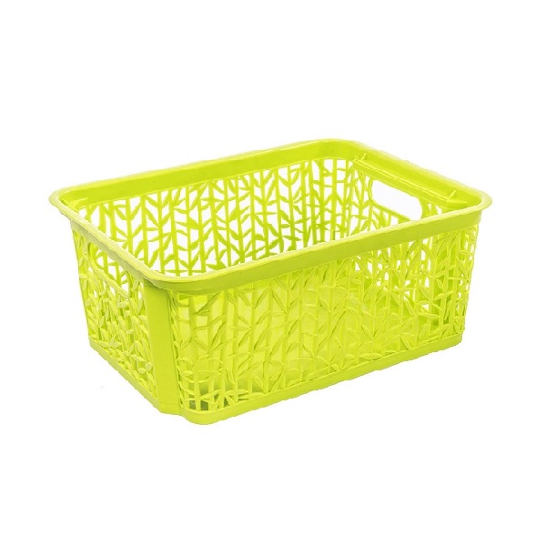 Plastikowy, ażurowy koszyk. Ażurowy wzór motywowany gałązkami i listkami bambusa. Koszyk wykonany z wysokiej jakości tworzywa. Rodzaj zastosowanego plastiku zapewnia bardzo dobre parametry wytrzymałościowe. Koszyk idealny do przechowywania i segregowania drobnych przedmiotów, zabawek, klocków, dziecięcych ubranek, dokumentów itp. Koszyki można piętrować - odpowiednio ustawiając koszyki wchodzą jeden w drugi lub w odwrotnej pozycji stoją jeden na drugim /tzw koszyki nastawne/.