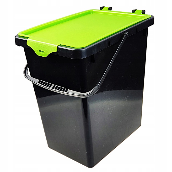Plastikowe, czarne wiaderko z kolorową pokrywką zamykaną na zatrzask. Rączka plastikowa do przenoszenia. Wiaderko do segregacji drobnych przedmiotów, klocków, zabawek itp. Może służyć jako pojemnik na proszek lub karmę. Można również wykorzystać do domowej segregacji śmieci. W kuchennej szafce o szerokości 60 cm można zmieścić trzy wiaderka, co bardzo ułatwia segregację przy małym metrażu.