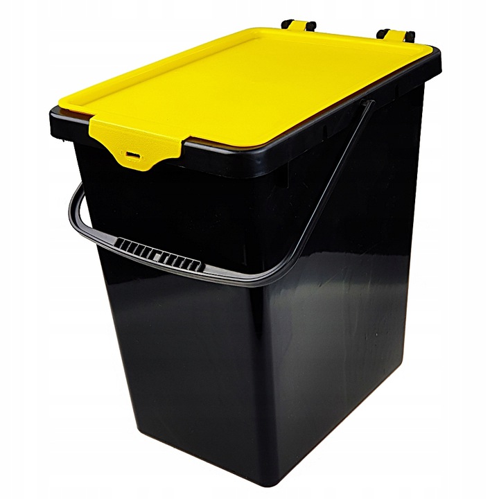 Plastikowe, czarne wiaderko z kolorową pokrywką zamykaną na zatrzask. Rączka plastikowa do przenoszenia. Wiaderko do segregacji drobnych przedmiotów, klocków, zabawek itp. Może służyć jako pojemnik na proszek lub karmę. Można również wykorzystać do domowej segregacji śmieci. W kuchennej szafce o szerokości 60 cm można zmieścić trzy wiaderka, co bardzo ułatwia segregację przy małym metrażu.
