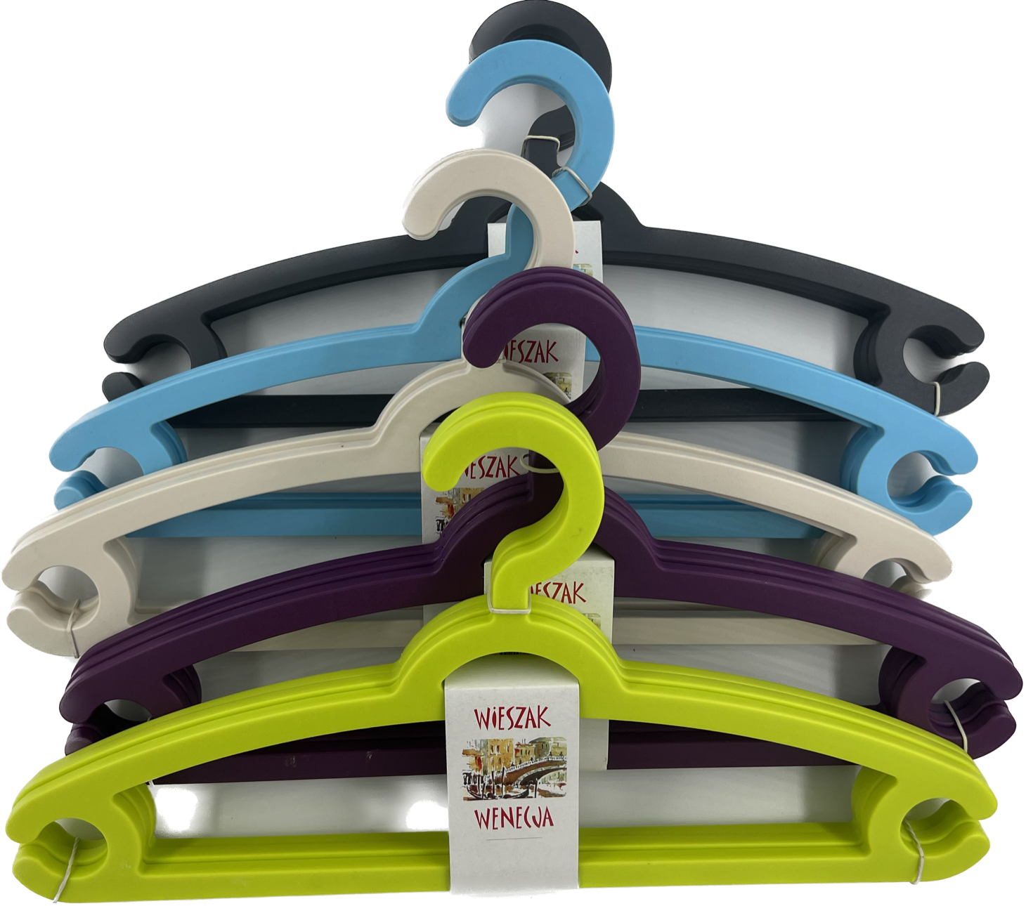 Komplet trzech wieszaków wykonanych z mocnego, trwałego plastiku. Boki ramion wieszaka idealnie zaokrąglone, dopasowane do kształtu odzieży. Wieszak z poprzeczką - można wieszać spodnie oraz z uchwytami do wieszania spódnic. Dostępne kolory: beż, grafit, jasno niebieski, jasno zielony, fioletowy - wydawane losowo, ewentualnie proszę w uwagach zaznaczyć, który kolor wydać.
